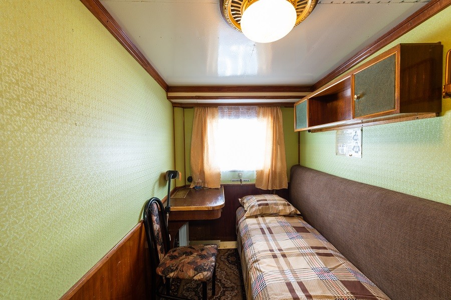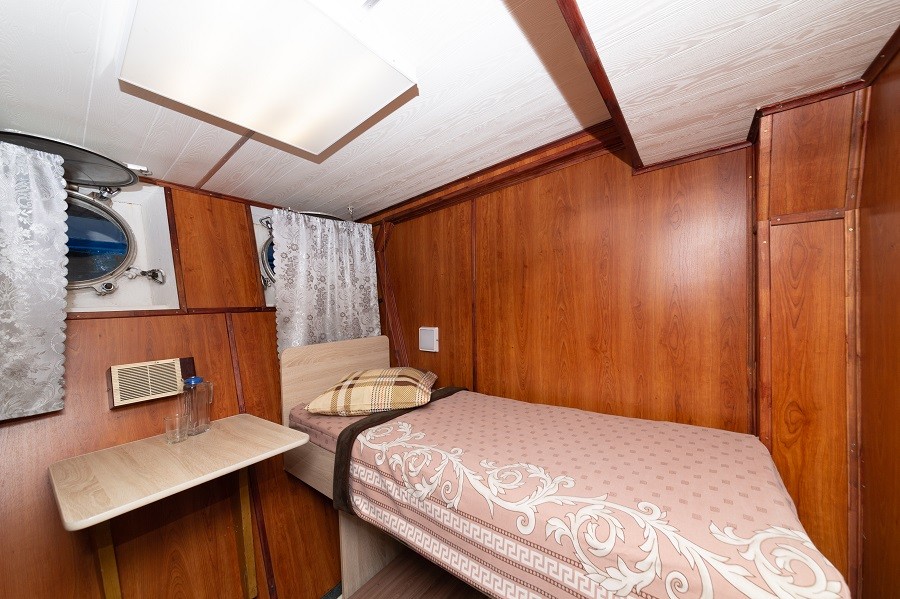 Одноместная каюта с частичными удобствами, расположенная на нижней палубе. В каюте: одно спальное место, розетка 220 V, радио, стол, стул, шкаф для одежды, раковина с горячей и холодной водой, иллюминаторы.