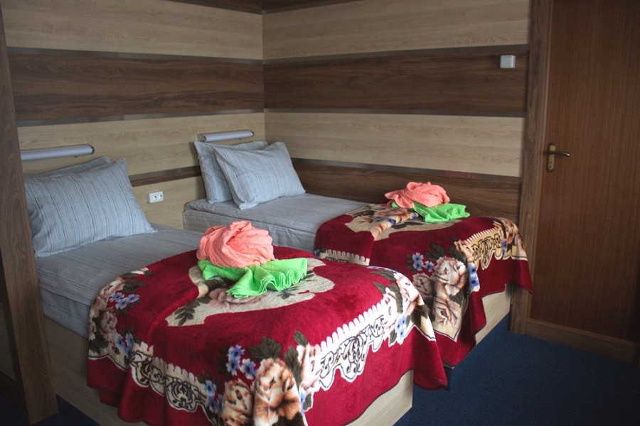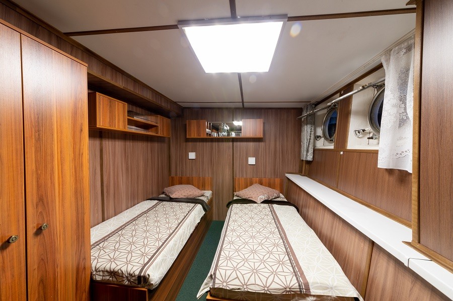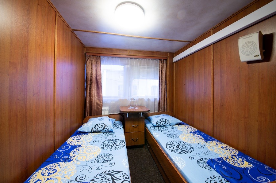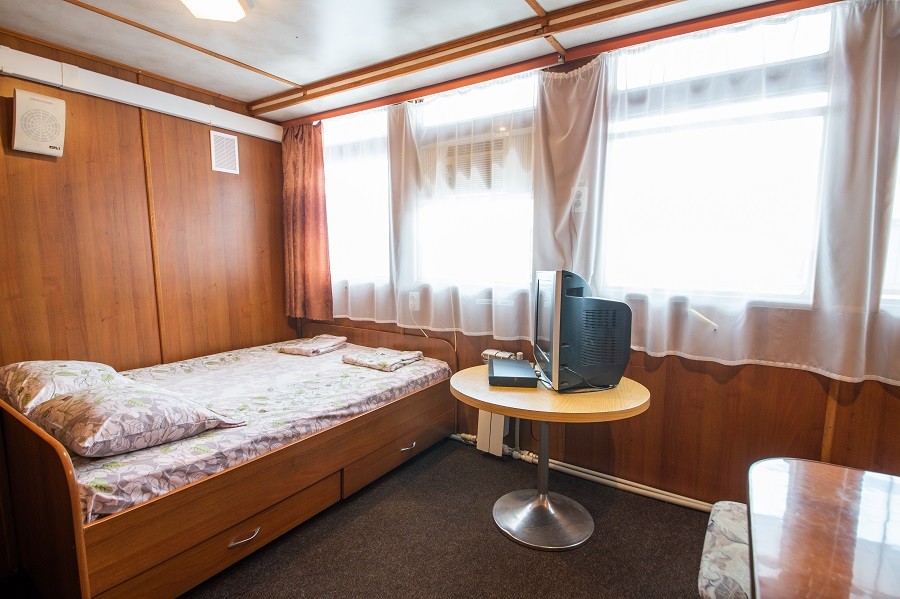 Двухместная каюта со всеми удобствами, расположенная на нижней палубе. В каюте: две односпальные кровати, ванная комната (раковина, душ, туалет), розетка 220 V, радио, стол, стул, шкаф для одежды, иллюминаторы.