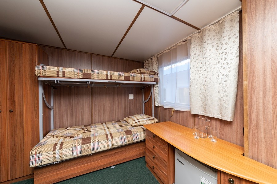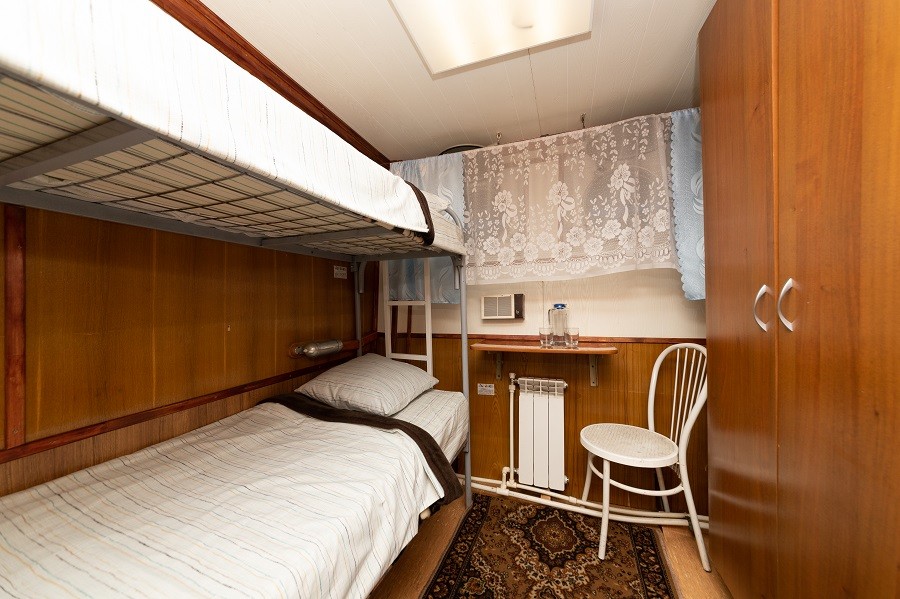 Четырехместная двухъярусная каюта со всеми удобствами, расположенная на главной палубе. В каюте: четыре односпальных места, расположенные одно над другим, шкаф для одежды, радио, ванная комната (раковина, душ, туалет), обзорное окно.