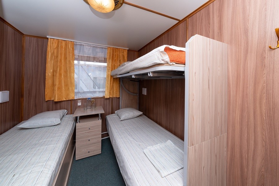 Трехместная двухъярусная каюта со всеми удобствами, расположенная на средней палубе. В каюте: три односпальных кровати (третье место расположено вторым ярусом), ванная комната (раковина, душ, туалет), розетка 220 V, радио, стол, стул, шкаф для одежды, обзорное окно.