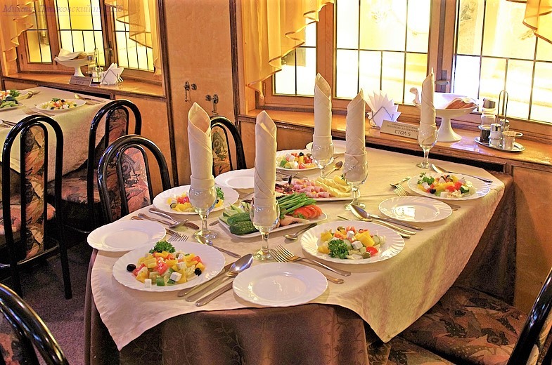 На борту ежедневное трехразовое питание, исключая день начала и день окончания тура. В день посадки — высадки питание предоставляется в зависимости от времени отправления — прибытия и программы круиза. В рейсах продолжительностью менее 5 дней питание организовано на основании заранее утвержденного меню. В более продолжительных рейсах питание организовано по методу предварительного заказа, выбор блюд со 2-ого дня круиза. В первый день круиза заказ блюд не осуществляется. Меню вывешивается ежедневно в салонах ресторана теплохода. Завтрак, обед, ужин — заказная система питания, В ресторанах фиксированная рассадка. В зависимости от загрузки возможно две смены питания. Спиртные напитки, соки, воды и иная продукция баров и ресторанов, не входящая в стоимость тура, оплачивается дополнительно. В случае, если время проведения экскурсии совпадает со временем приема пищи, туристу выдается «сухой паек».