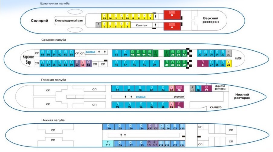На борту для размещения туристов представлены разные категории кают: от двухкомнатных «Люксов» до четырехместных кают с частичными удобствами. Для соло-путешествий есть большое количество одноместных кают с частичными удобствами.