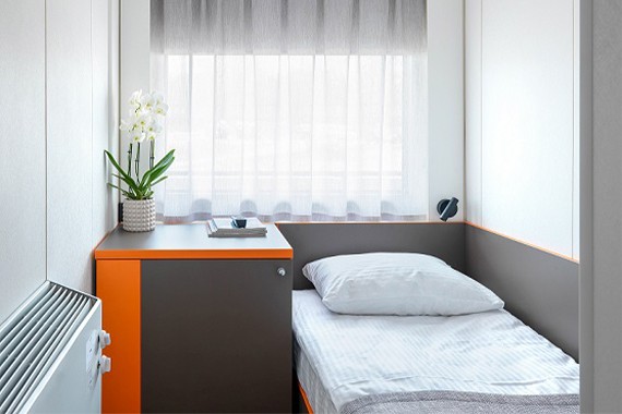 Одноместная каюта со всеми удобствами. Площадь каюты ≈ 7,2 м². Размер кровати – 80х190 см. В каюте: односпальная кровать, ванная комната (раковина, душ, туалет), шкаф для одежды, сейф, радио, телевизор, кондиционер, холодильник, фен, туалетные принадлежности, тапочки, розетка 220V, обзорное окно.