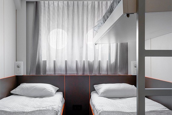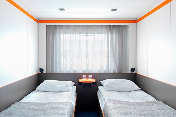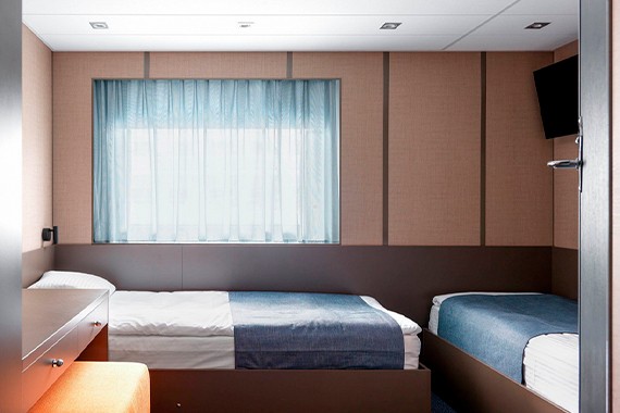 Двухместная каюта со всеми удобствами. Площадь каюты от 10,3 до 15,5 м². Размер кровати – 80х180 см. В каюте: две односпальные кровати, ванная комната (раковина, душ, туалет), шкаф для одежды, сейф, радио, телевизор, кондиционер, холодильник, фен, туалетные принадлежности, тапочки, розетка 220V, обзорное окно.