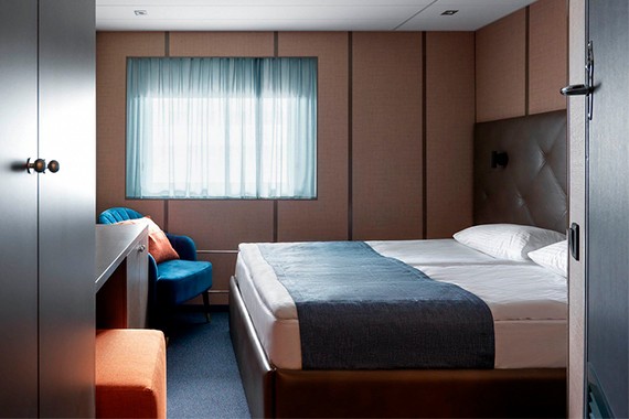 Двухместная каюта со всеми удобствами. Площадь каюты от 10,3 до 15,5 м². Размер кровати – 160х200 см. В каюте: двуспальная кровать, ванная комната (раковина, душ, туалет), шкаф для одежды, сейф, радио, телевизор, кондиционер, холодильник, фен, туалетные принадлежности, тапочки, розетка 220V, обзорное окно.