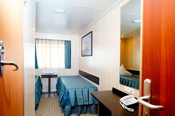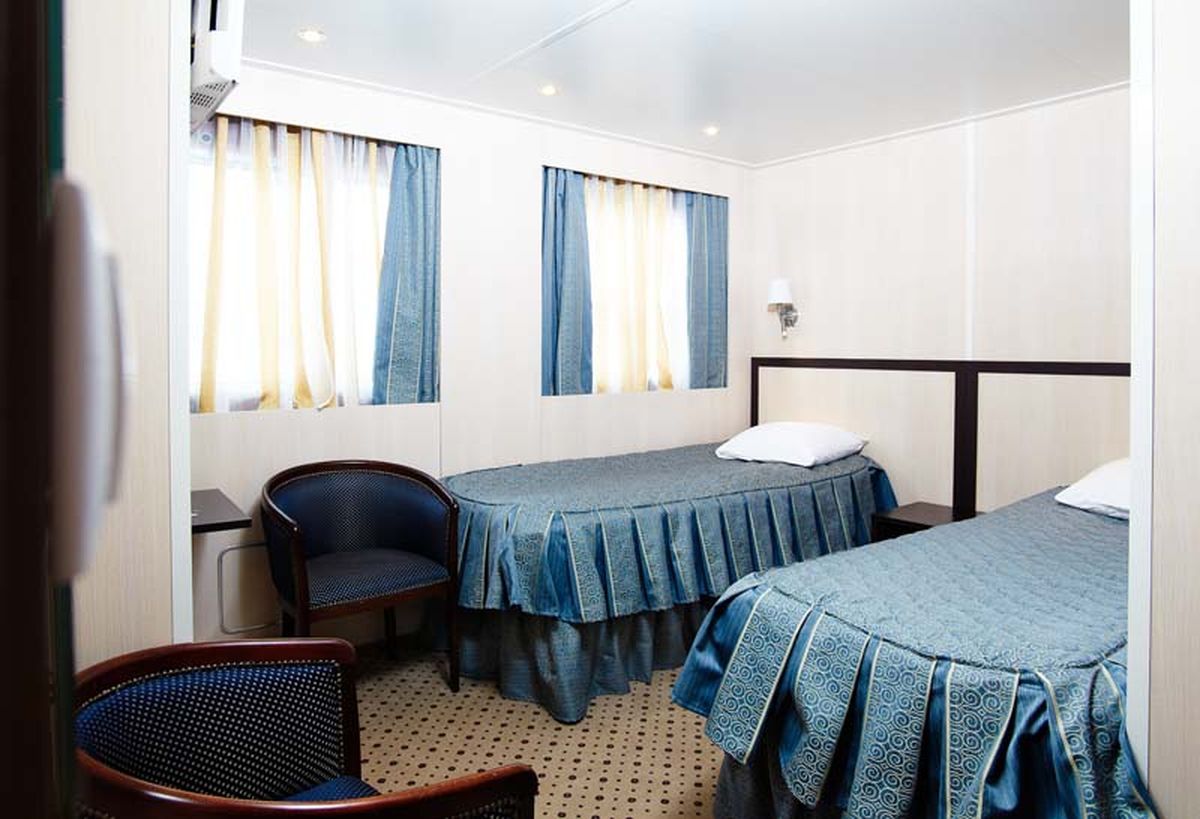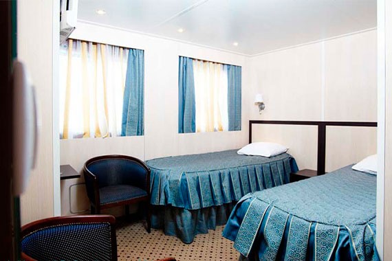 Двухместная одноярусная каюта со всеми удобствами на шлюпочной палубе. В каюте: два спальных места, индивидуальный санблок (умывальник, туалет, душ), кондиционер, телевизор, холодильник, электророзетка 220В. Каюты №: 401-428.