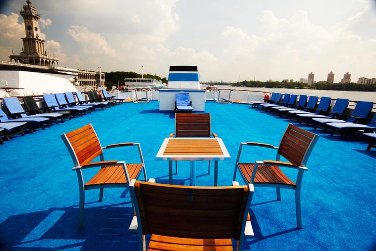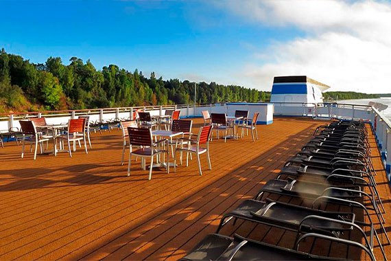 На верхней палубе теплохода предусмотрены места для принятия солнечных ванн.