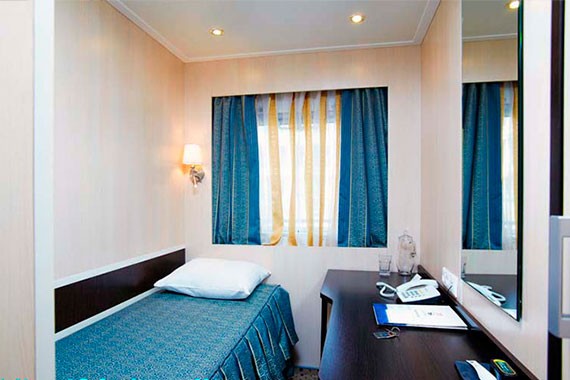 Одноместная каюта со всеми удобствами на средней палубе. В каюте: одно спальное место, индивидуальный санблок (умывальник, туалет, душ), кондиционер, телевизор, холодильник, электророзетка 220В. Каюты №: 309, 310, 347, 348.