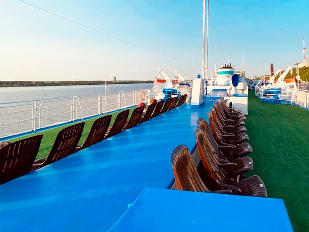 Для отдыха на свежем воздухе отлично подойдёт шлюпочная палуба, оборудованная шезлонгами — здесь приятно загорать и любоваться пейзажами в солнечную погоду.