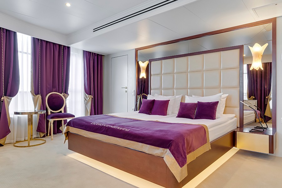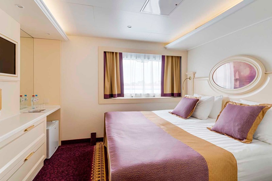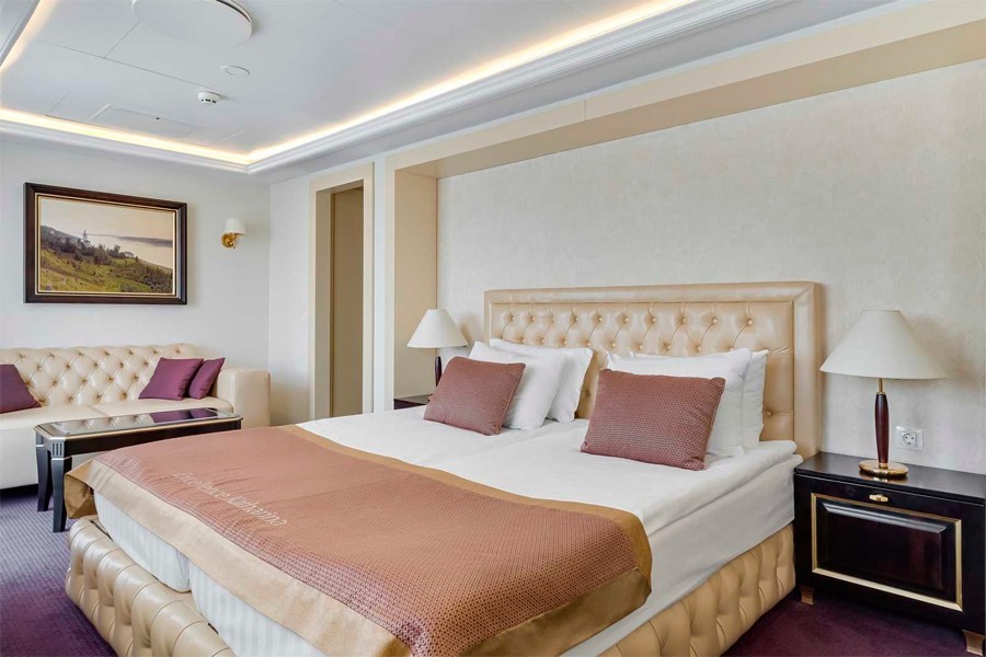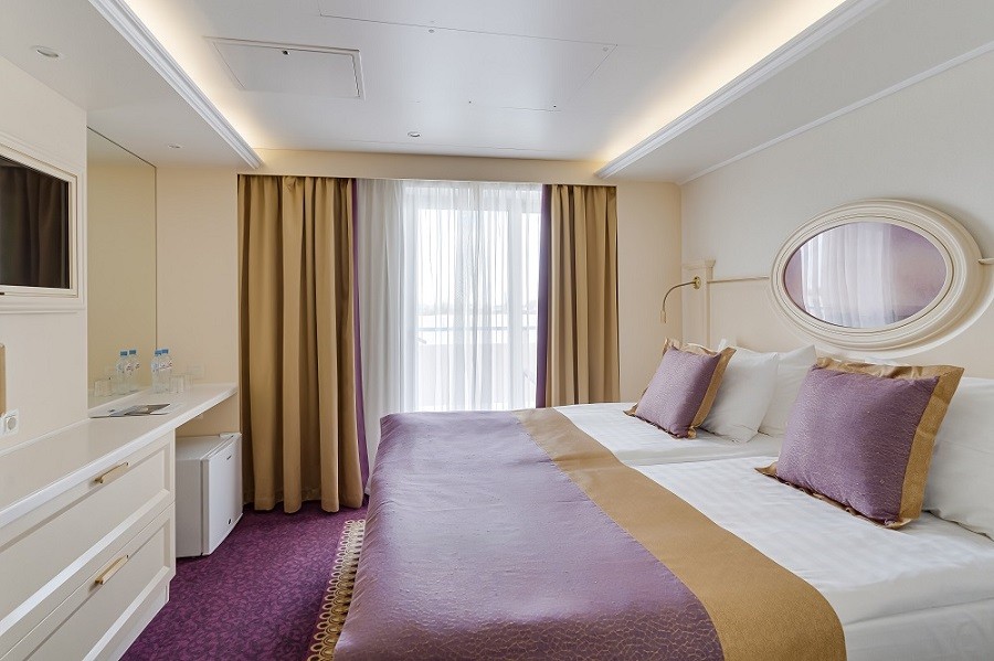 Для комфортного путешествия гостям предлагается 91 двухместная каюта с современными дизайнерскими интерьерами, выполненными в светлых тонах: 2 каюты «Панорамный люкс с балконом»; 10 кают «Люкс с балконом»; 51 каюта «Полулюкс с балконом» и 28 кают «Комфорт Премиум».