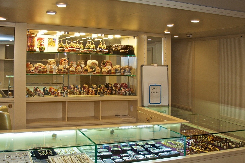 На борту теплохода работает сувенирный киоск, где каждый гость сможет найти приятные памятные подарки о путешествии. В ассортименте — оригинальные сувениры, изделия местных мастеров, тематическая продукция с символикой круиза, книги, открытки и другие приятные мелочи, которые станут напоминанием о ярких днях на борту.