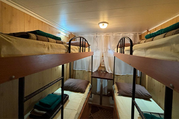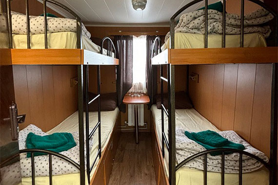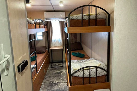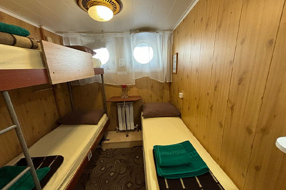 К категории Эконом+ 2+2 (главная палуба) относятся каюты: 78-87. Двухместная двухъярусная каюта с частичными удобствами, расположенная на главной палубе. Возможно размещение третьего и четвертого человека на дополнительных местах верхнего расположения. В каюте: две двухъярусные кровати, раковина, столик, зеркало, обзорное окно.