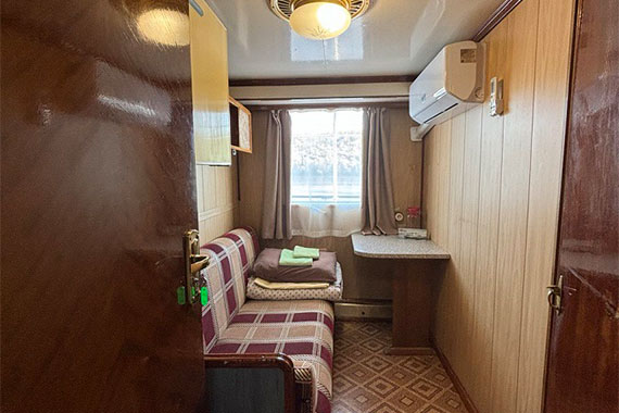К категории Эконом одноместная (шлюпочная палуба) относятся каюты: 1-12, 14, 16. Одноместная каюта с частичными удобствами, расположенная на шлюпочной палубе. Возможно размещение второго человека на дополнительном месте - раскладной диван. В каюте: раскладной диван, шкаф для одежды, столик, кондиционер, полочка для книг, зеркало, раковина, холодильник, обзорное окно.